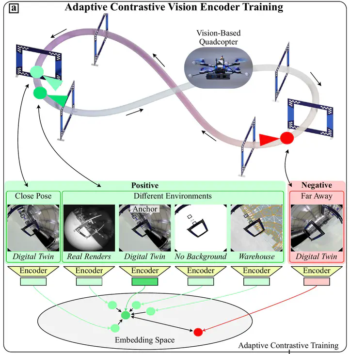 Scene transfer for vision-based mobile robotics applications is a highly relevant and challenging problem. The utility of a robot greatly depends on its ability to perform a task in the real world, outside of a well-controlled lab environment. Existing scene transfer end-to-end policy learning approaches often suffer from poor sample efficiency or limited generalization capabilities, making them unsuitable for mobile robotics applications. This work proposes an adaptive multi-pair contrastive learning strategy for visual representation learning that enables zero-shot scene transfer and real-world deployment. Control policies relying on the embedding are able to operate in unseen environments without the need for finetuning in the deployment environment. We demonstrate the performance of our approach on the task of agile, vision-based quadrotor flight. Extensive simulation and real-world experiments demonstrate that our approach successfully generalizes beyond the training domain and outperforms all baselines.