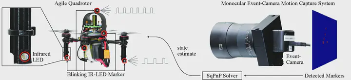 Motion capture systems are a widespread tool in research to record ground-truth poses of objects. Commercial systems use reflective markers attached to the object and then triangulate pose of the object from multiple camera views. Consequently, the object must be visible to multiple cameras which makes such multi-view motion capture systems unsuited for deployments in narrow, confined spaces (e.g. ballast tanks of ships). In this technical report we describe a monocular event-camera motion capture system which overcomes this limitation and is ideally suited for narrow spaces. Instead of passive markers it relies on active, blinking LED markers such that each marker can be uniquely identified from the blinking frequency. The markers are placed at known locations on the tracking object. We then solve the PnP (perspective-n-points) problem to obtain the position and orientation of the object. The developed system has millimeter accuracy, millisecond latency and we demonstrate that its state estimate can be used to fly a small, agile quadrotor.